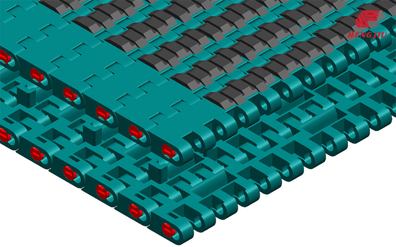 带橡胶垫/顶部带橡胶条带有橡胶垫的爬坡/下坡链网能够光滑顺畅的运输包装物,这些橡胶垫通过注塑成型被粘结在特制模块上。根据包装方式和材料,橡胶垫模块化链网可以在角度最大至20度的场合使用。