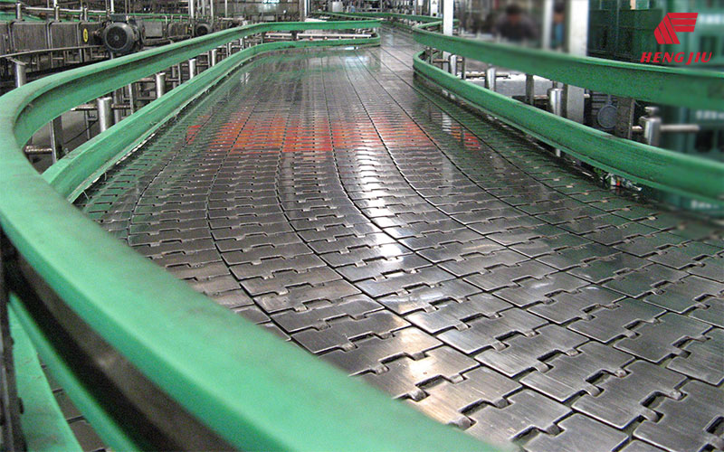 不锈钢平顶链规格多达60余种,其选型应根据输送机的使用工况来确定,涉及要素应包括但不仅限于如物品特性、物品对环境的要求、装载量、链条线速度、链条与导轨的摩擦系数、主从动轮间中心距、润滑条件、温度等。在润滑条件良好的条件下,平顶链的传送线速度最高可达到120m/min。