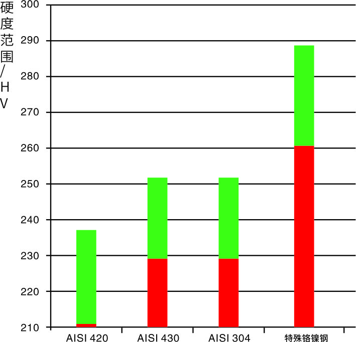 不同材料链板的表面硬度范围(绿色区)如下图表。