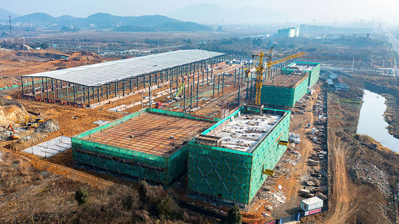 本项目的行政楼、研发楼、倒班宿舍楼现都已经结顶,开始墙体砌筑;1#车间正浇二层楼面的梁板工作,年内完成二层柱梁浇筑;2#厂房露天跨以北钢结构件吊装已完成,外墙墙体开始砌筑,年内彩钢瓦屋顶已启动施工;2#厂房露天跨以南,钢柱吊装基本完成。预计于2022年7月中旬完成全部工程项目,并进入验收阶段,计划于10月上旬开始试生产。