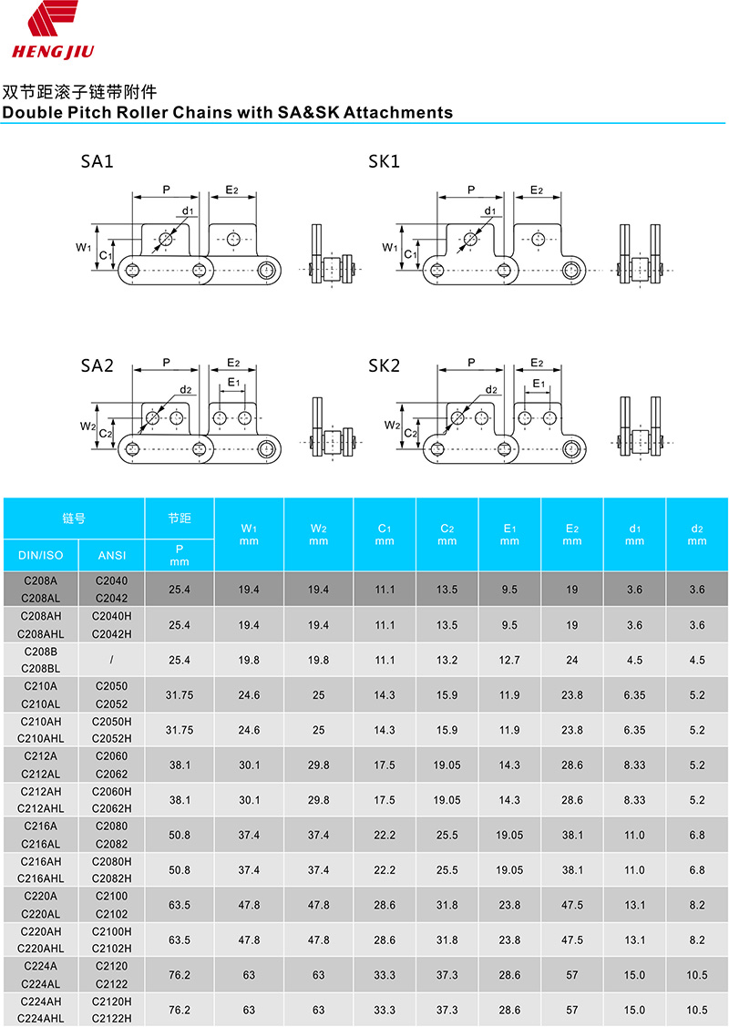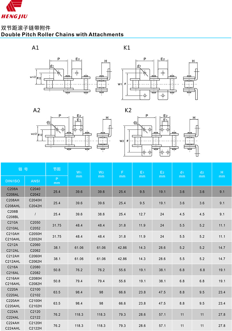 双节距滚子链是由短节距滚子链派生出来的,它的节距是后者的一倍,其它结构形式与零件尺寸相同。与短节距精密滚子链相比,它是一种轻型链条,适用于传递功率小,速度较低,传动中心距离更长的场合。