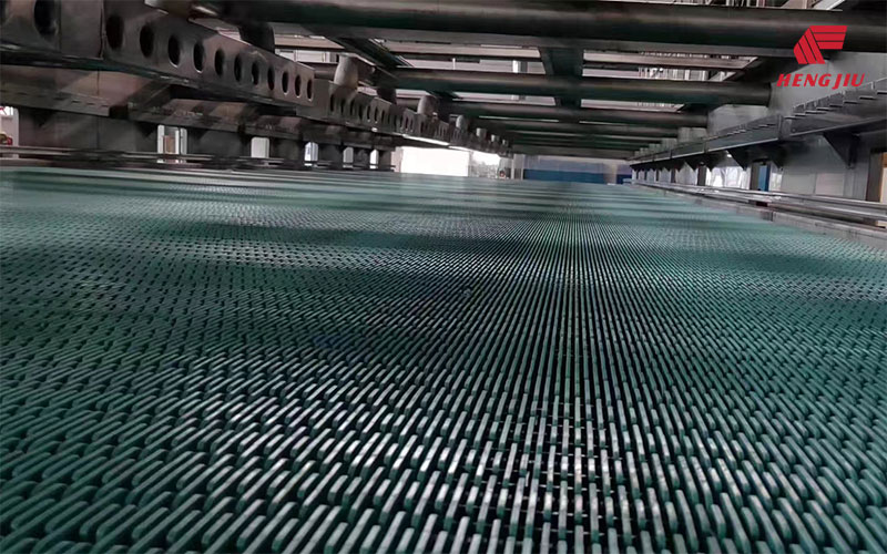 带橡胶垫/顶部带橡胶条带有橡胶垫的爬坡/下坡链网能够光滑顺畅的运输包装物,这些橡胶垫通过注塑成型被粘结在特制模块上。根据包装方式和材料,橡胶垫模块化链网可以在角度最大至20度的场合使用。