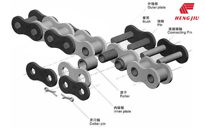 滚子链是一种用于传送机械的动力链条,是链传动的一种重要类型,广泛应用于工业、农业机械,畜牧业等机械设备中,其中包括印刷机、汽车、摩托车、自行车、石油钻探、设备驱动等。
