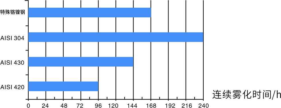 JW-60-SS盐水喷雾试验机试验,符合GB/T 10125 《人造气氛腐蚀试验 盐雾试验》标准中NSS中性盐雾试验条件,不同材料的链板首次出现点蚀现象的连续雾化时间如下图表。