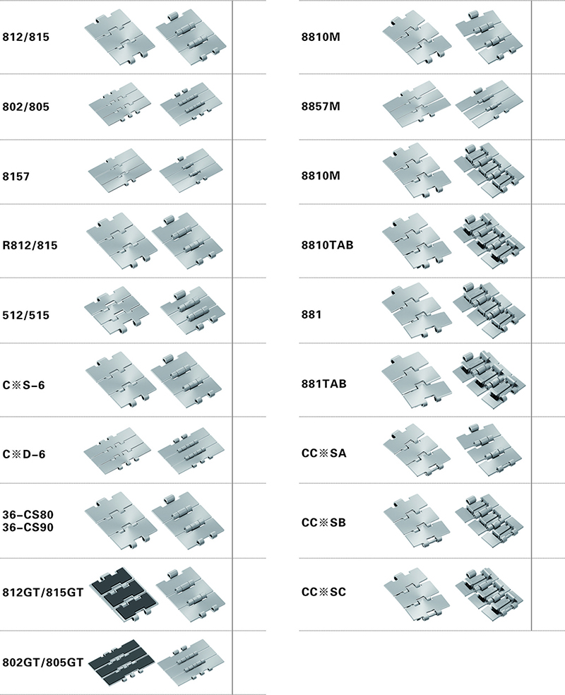 不锈钢平顶链规格多达60余种,其选型应根据输送机的使用工况来确定,涉及要素应包括但不仅限于如物品特性、物品对环境的要求、装载量、链条线速度、链条与导轨的摩擦系数、主从动轮间中心距、润滑条件、温度等。在润滑条件良好的条件下,平顶链的传送线速度最高可达到120m/min。